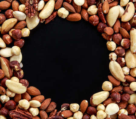 Some of different nuts with black frame for your text pecan, pistachios, almond, peanut, cashew, pine nuts on dark stone background, top view.