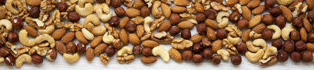 Assorted mixed nuts (cashew, hazelnuts, walnuts, almonds) on white wooden surface, overhead view. From above.
