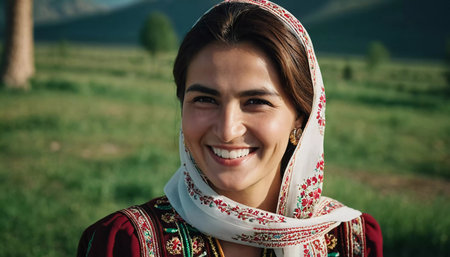 A Tajik woman 30 years old stands gracefully, showcasing her traditional attire against a breathtaking backdrop of mountains and lush green fields, reflecting her cultural roots. Generated by AI.