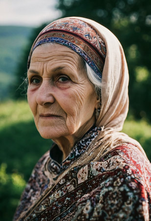 A thoughtful older woman gazes into the distance, adorned in traditional Chechen attire. Her intricate headscarf and elegant garments reflect the rich history and culture of the region.