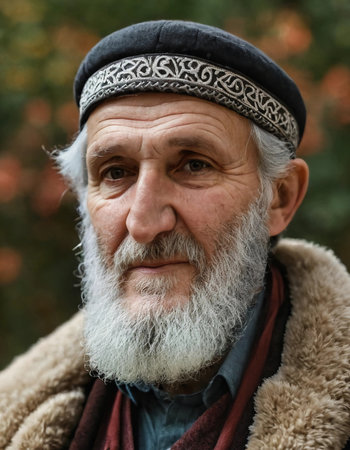 A Chechen man with a distinguished beard presents a serene expression, embodying the rich traditions of Chechnya.