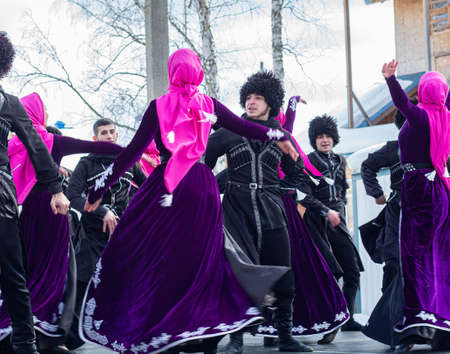 Tliarata. Russia, April 07, 2021. Men and women in national costumes perform Dagestan dance at the annual spring festival The First Furrow (the beginning of the sowing season in the Caucasus).