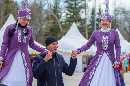 Petropavlovsk, Kazakhstan - May 1, 2019: Songs and dances in the national costumes of the peoples of Kazakhstan. May 1 in Kazakhstan is the Day of Unity of the People.