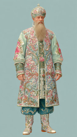 A full-length portrait of a Tsar in traditional attire, showcasing intricate embroidery and regal presence.