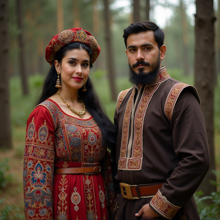 Masuleh, Iran - May 2019: Iranian couple in Persian traditional clothes at village of Masuleh in Gilan province