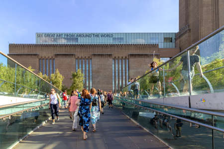 LONDON, UK - AUGUST 2, 2018: People at the famous Millenium Bridge, whit The Tate Modern art gallery in the background, London, United kingdom.
