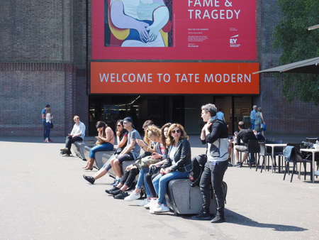 LONDON, ENGLAND - August 11 2017 Entrance to the Tate Modern Museum. Spiritual people leave the museum.