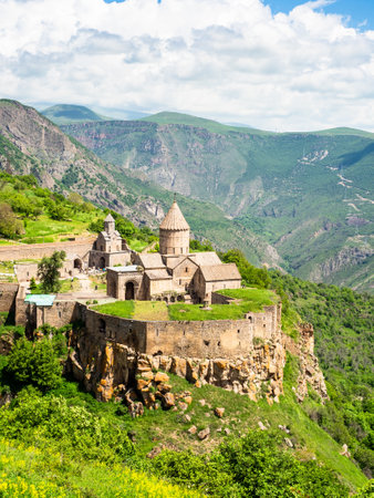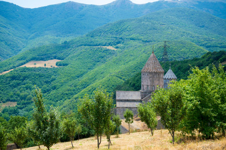 Scenic Tatev monastery view in Armenia. Ancient church ruins. Armenian landscape of Tatev monastery complex surrounded by green mountains and lush green hills stock photo