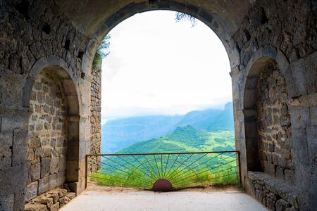 view of green mountains from room of Tatev Monastery in Syunik Province of Armenia on sunny May morning