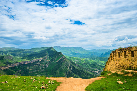 Beautiful view of the picturesque green mountains and fortification wall of the Russian fortress Gunib. Dagestan, Caucasus