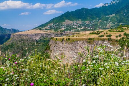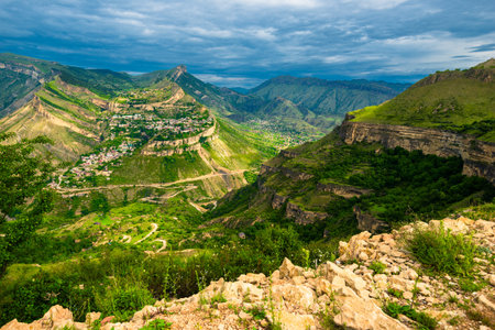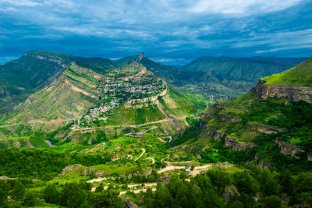 Gunib village in the mountains of Dagestan, Caucasus, Russia. Summer landscape at sunrise. Famous tourist destination of Dagestan