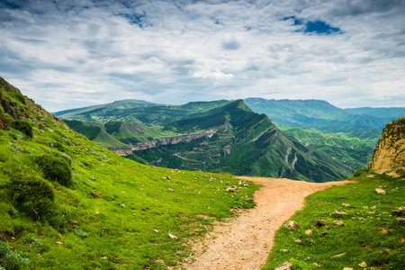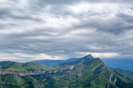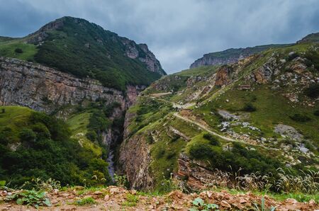 Picturesque mountain landscape with green slopes and road. North Caucasus