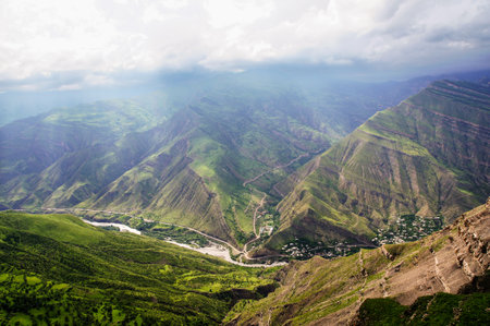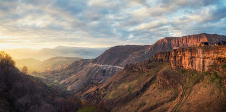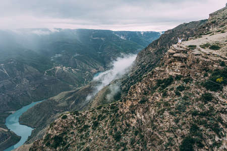 Soft focus. Amazing spring landscape with silhouettes of big rocky mountains and epic deep gorge with river. The edge of a rocky cliff with a beautiful panoramic view of the gorge. Dagestan.