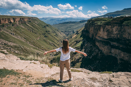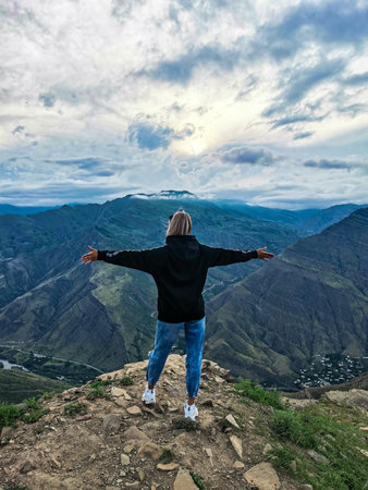 A girl on the background of a view of the Matlas plateau. Khunzakhsky district. Dagestan Russia