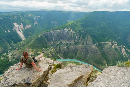 Hike in the mountains. A man with a backpack sits on the edge of a cliff and looks at the view.