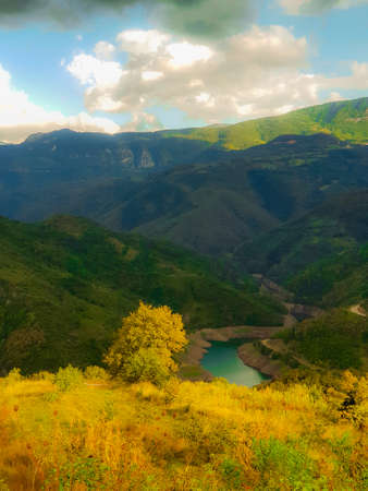 mountain landscape, view of the deep canyon with blue water, valley of the Sulak river in Dagestan