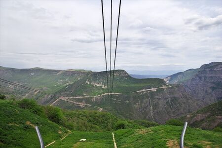 view of the mountain road, city and mountains from the funicular near Tatev Monastery