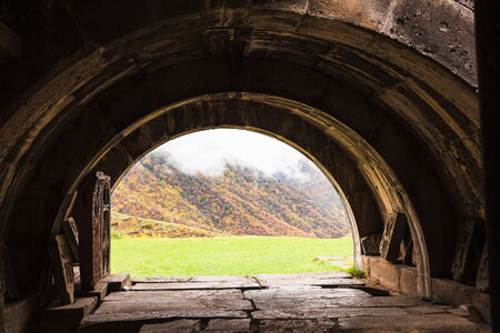 view of the church through the oval arch in Armenia