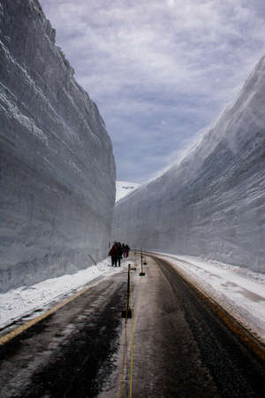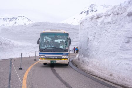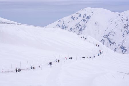 Tateyama, Japan - April 21, 2019 : Unidentified people visiting Murodo snow field on Tateyama Kurobe Alpine Route, Japanese Alp in Tateyama, Japan.