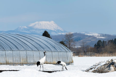 Landscape of Mt.Akan with pair of Red-crowned Cranes