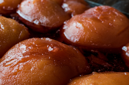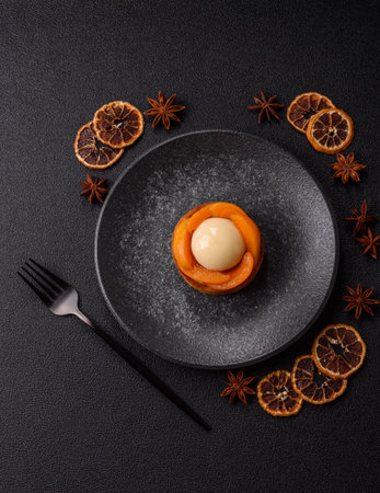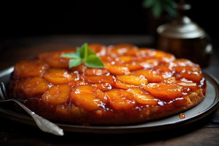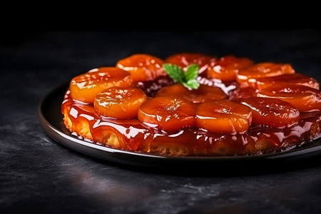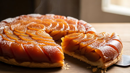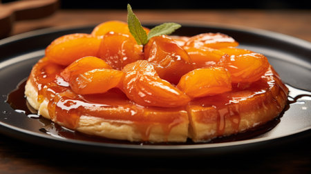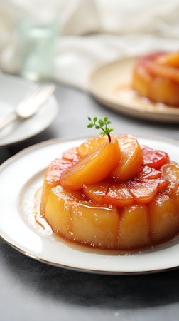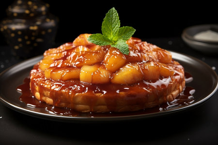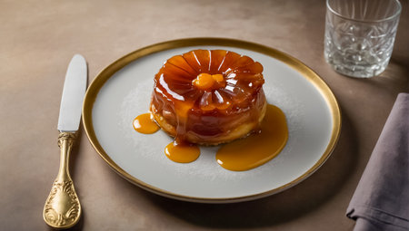 Golden caramelized apples adorn a buttery, upside-down tarte tatin. Flaky layers cradle a sweet symphony, a masterpiece of rich flavors and indulgence.