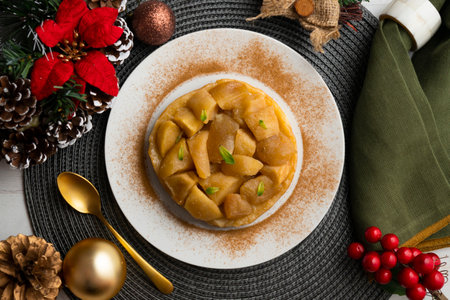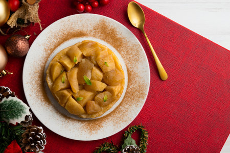 Delicious tarte tatin with apples from an overhead perspective. Food on a Christmas table.