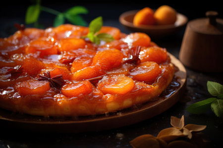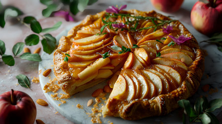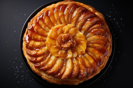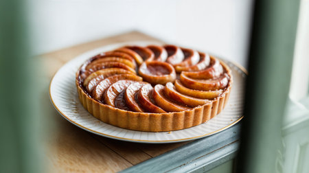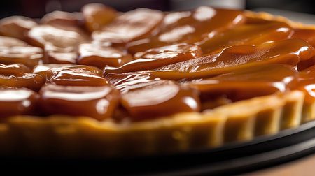 A beautifully presented apple tart with caramel glaze, showcasing the rich texture and golden fruit. Perfect for dessert lovers and baking enthusiasts.