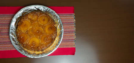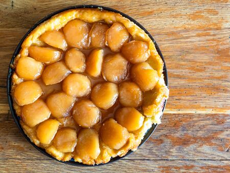 top view of home-made caramelised apple pie Tarte Tatin on old wooden table in home kitchen with copyspace