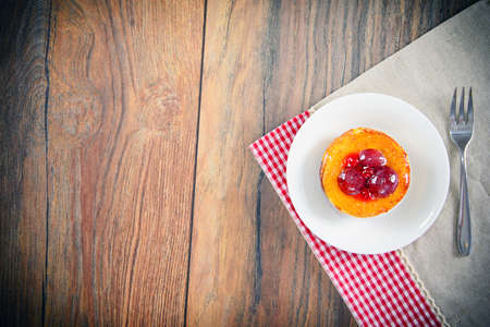 Top view of slice of macadamia cheesecake on white dish or plate with copy space on right. Fat lay of Sweet dessert and Homemade food at cafe shop.