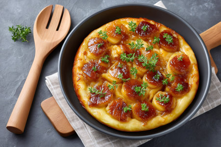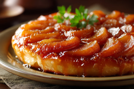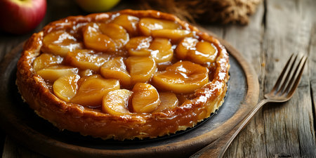 Traditional French tarte Tatin with glossy caramelized apples on a golden pastry crust served on a rustic wooden surface