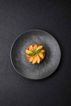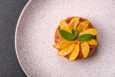 Sweet round pie or tart with apples and peach, cream and nuts. Mini sweet tart with fruit slices
