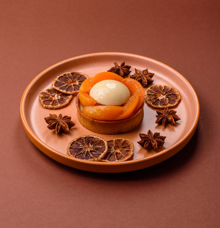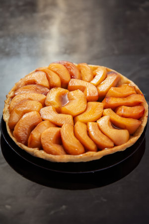 Sweet round tart with apricot pieces, cream and nuts. Sweet tart with peach as a food background