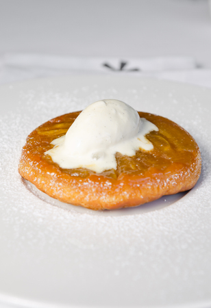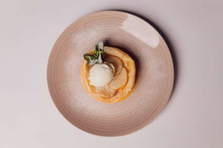 A close up of a Tarte Tatin dessert with vanilla ice cream and mint on a white plate, outdoors.