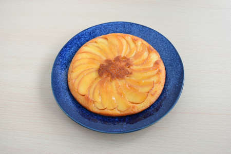 Apple pie Tarte Tatin with caramel on a glass plate on blue wooden table