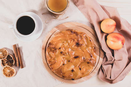 Pie, sweet round tart with apricot pieces, cream and nuts. Sweet tart with peach as a food background