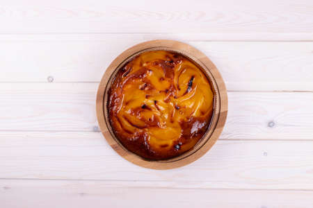 Sweet caramel pudding with peaches on a white plate, selective focus