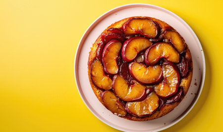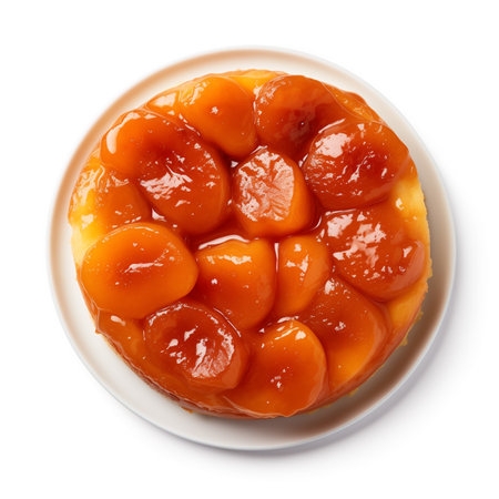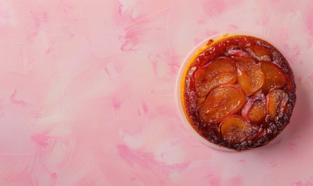 Top view of French tarte tatin with caramel, with ample copy space on a plain backdrop.