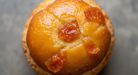An extreme close-up, top-down macro shot of a gourmet pastry, possibly a small tart or bun. It has a shiny, golden-brown glaze and is topped with pieces of candied fruit, highlighting its delicate texture.