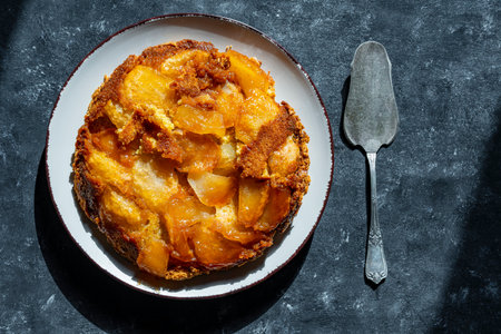 Classic upside-down apple cake. Retro apple cake recipe, cooked in frying pan easy autumn summer homemade baking sweet pastry, with fresh green apples copy space