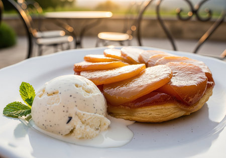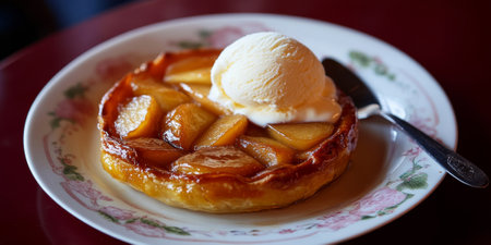 A delicate French tarte tatin, with caramelized apples baked in buttery pastry, served warm with a scoop of vanilla ice cream on a ceramic dessert plate. The dish feels elegant and indulgent.