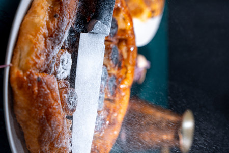 Put a knife on the pie and sprinkle powdered sugar on top to get the contour on the pie. On a dark background a banana tart. High quality photo