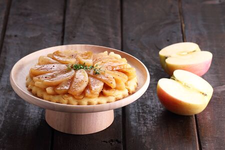 Apple tart tatin on a wooden board on a gray table. The concept of sweet pastries with fruits.