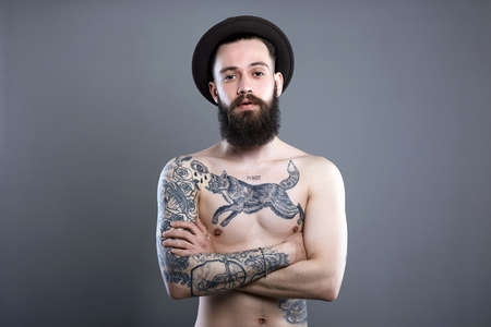 Handsome Bearded Man in Hat. Hipster boy with tattoed body