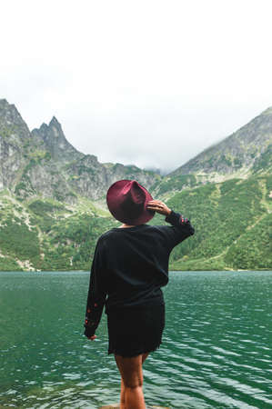 Vertical portrait of a stylish woman in a hat stands with her back against the background of a beautiful mountain lake and cloudy sky. Fashionable woman in a dark dress posing on the shores of lake