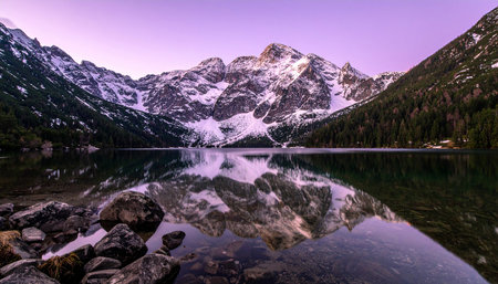 Panorama of the Tatra Mountains on Morskie Oko in winter.