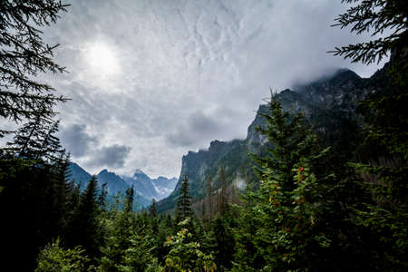 Mysterious landscape the dense fog falling on the mighty Tatras Mountains in Slovakia. Beauty and strength of wild untouched nature. Ideal background for fairy tales illustrations and collages.