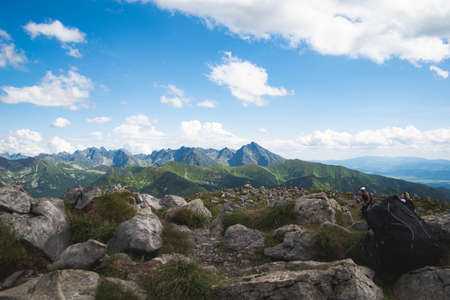 A woman at the top of the mountain, admiring mountain scenery. Tatra mountains landscape from the summit.