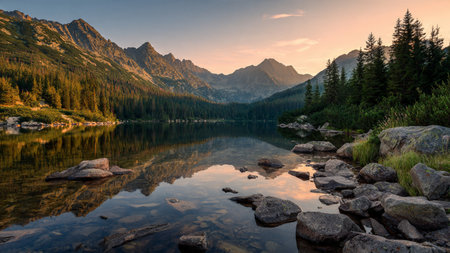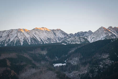 Tatra mountains at sunset with forest valley landscape at autumn in Poland. Majestic view
