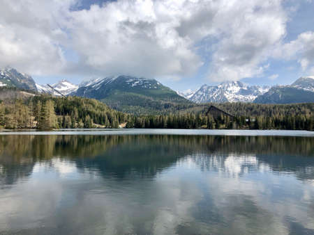 The magnificent panoramic view the crystal clear mountain Strbske Pleso lake in the picturesque valley. The mighty snow-covered Tatras in the National Park, Slovakia. Serenity of wild virgin nature.