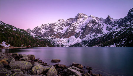 Great mountains landscape Tatry amazing lake Morskie oko in Poland. Incredible clear water.